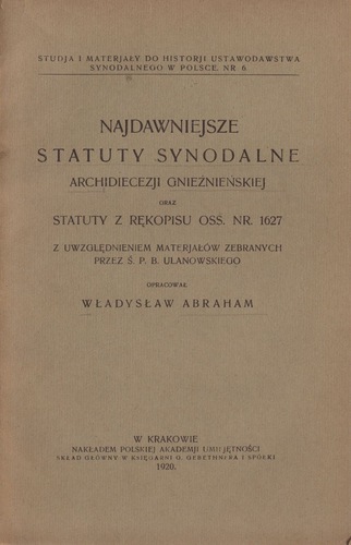 Statuty synodalne wieluńsko-kaliskie Mikołaja Trąby z r. 1420 / z materiałów przysposobionych przez B. Ulanowskiego uzup. i wyd. Jan Fijałek i Adam Vetulani ; Polska Akademia Umiejętności
